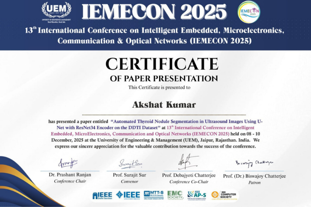 Akshat Kumar presented a research paper at the International Conference IMECOM 2025 held at UEM Jaipur in January 2025.