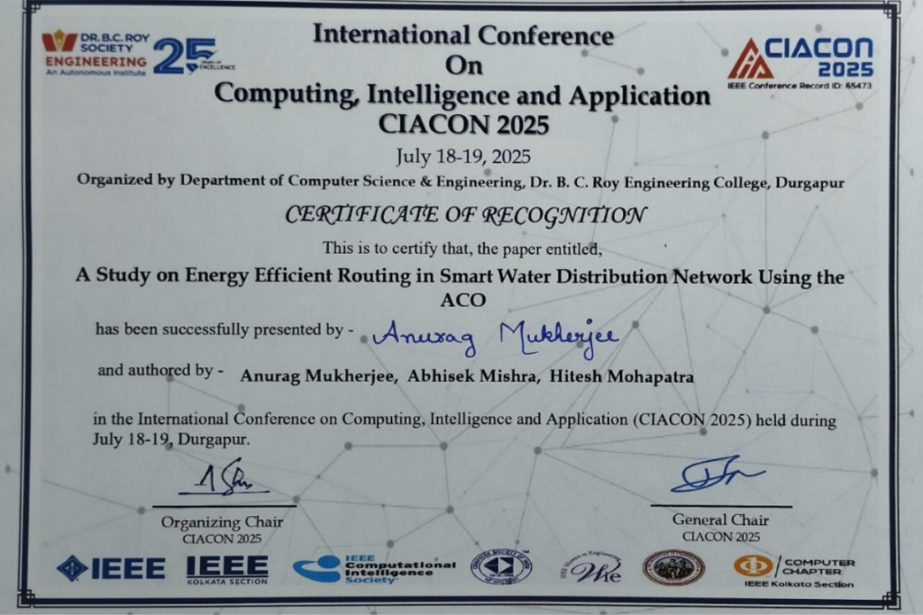 Anurag Mukherjee presented a research paper titled “A Study on Energy Efficient Routing in Smart Water Distribution Network Using the ACO” (Authors: Anurag Mukherjee,