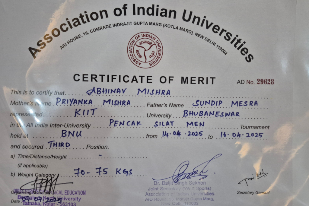 Abhinav Mishra won a bronze medal in 70 – 75 kg men’s category in All India Inter-University Pencak Silat Championship hosted by Bengaluru North University