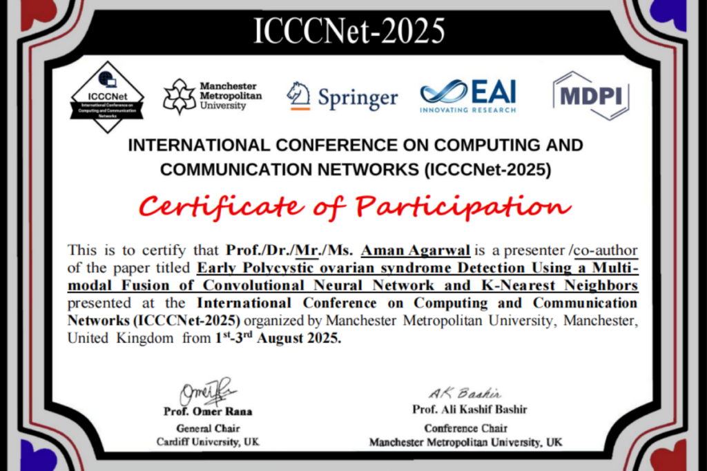 Aman Agarwal was Presenter/ co-author of the paper titled “Early Polycystic ovarian syndrome Detection Using a Multi modal fusion of Convolutional Neural Network and K-Nearest Neighbors