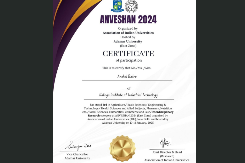 Anchal Batra, along with Vidhi Vanshita Jha and Smriti jha secured 3rd position at the International student convention 2024-25 held by AIU at Adamas University on 17th-18th January 2025. The team stood 3rd in the zonal level and qualified for the national level.