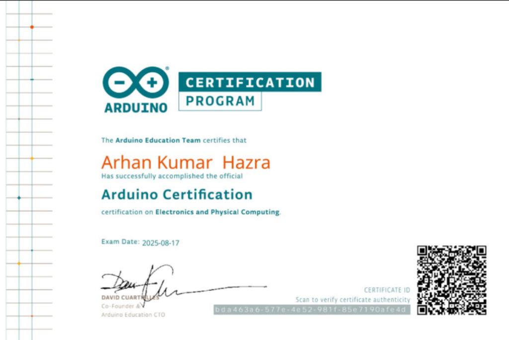 Arhan Kumar Hazra successfully qualified an Arduino Certification Test in 17 . 8 . 2025, demonstrating proficiency in embedded systems, Arduino programming, sensor interfacing, and real-time hardware-based problem solving.