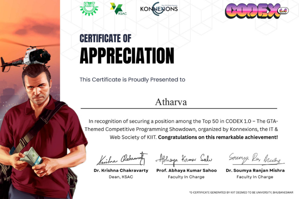 Atharva (Roll No. 2305688) was selected among the Top 50 participants and featured in the Hall of Fame at Codex 1.0, a technical coding competition organized by the Konnexions Society, KIIT University, held in December 2025.