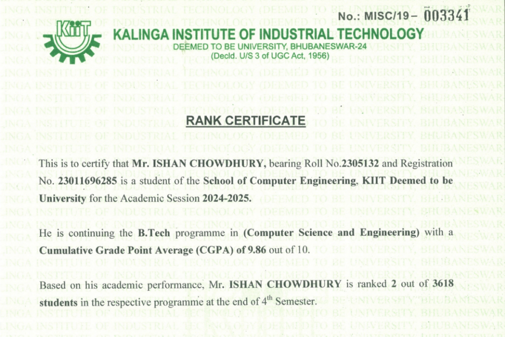 Ishan Chowdhury received In 3rd semester received a 10 SGPA and in 4th semester also received a 10 SGPA, Currently ranked second in my department of Computer Science with overall cgpa of 9.86