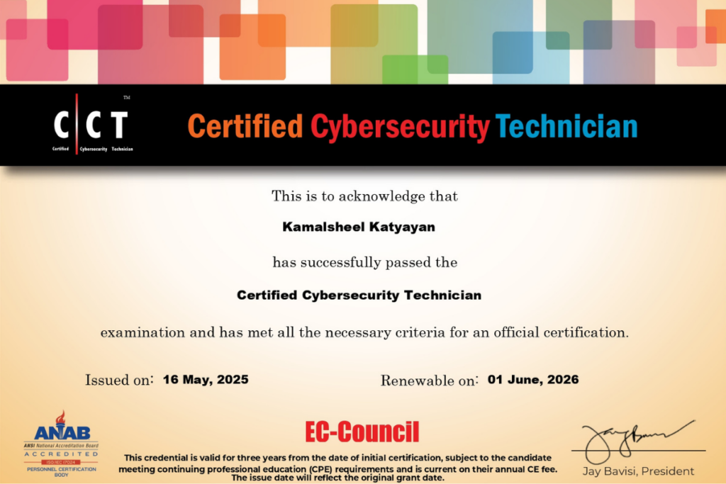 Kamalsheel Katyayan received the CCT Global Certification in 2025 on a merit basis, recognizing demonstrated proficiency in cybersecurity principles, network security, and industry-aligned security practices within a globally recognized certification framework.