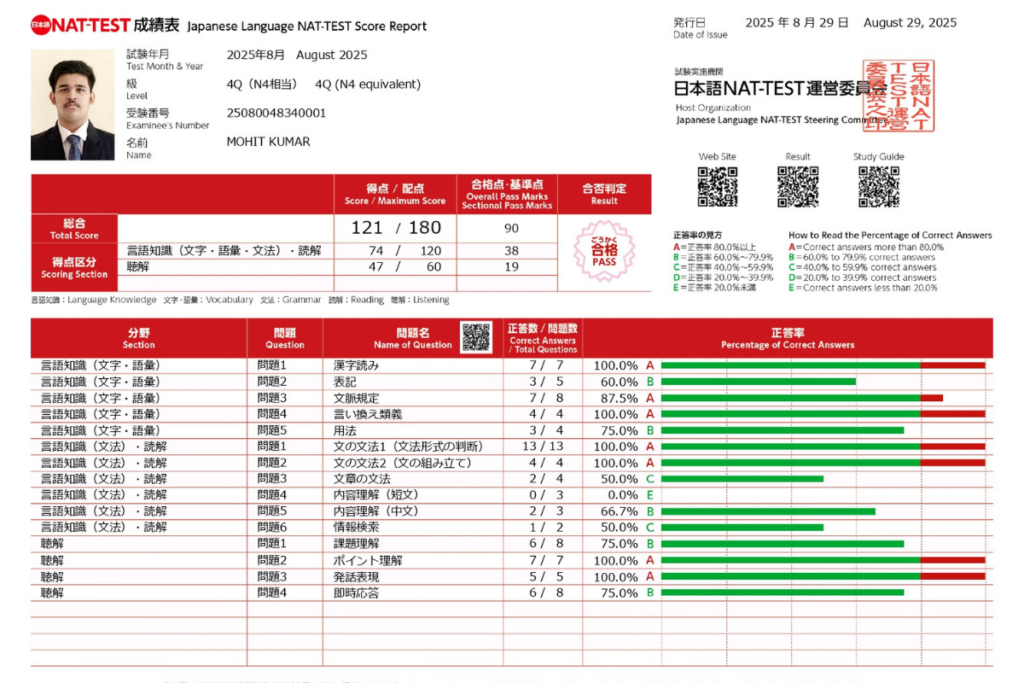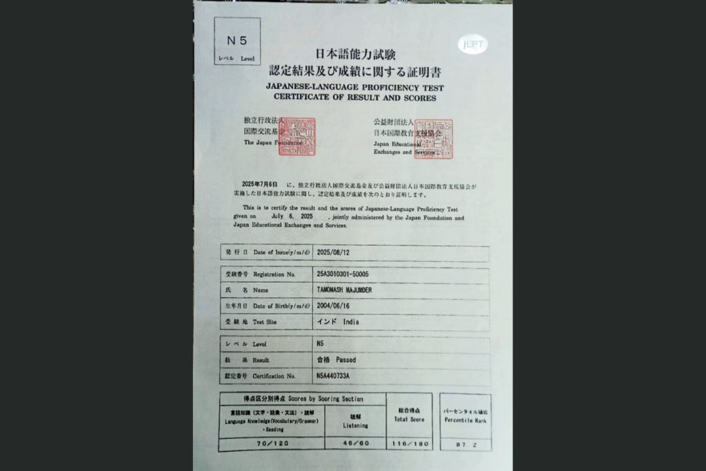 Tamonash Majumder passed JLPT N5 in 2025 allowing him to explore various career oppertunities in Japan
