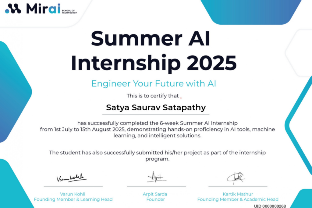Satya Saurav Satapathy received the internship completion certificate from the organization done virtually for the oganization Mirai School of Technology and also got a letter of Recommendation (LOR) which was done for 2 months (i.e; July and August)