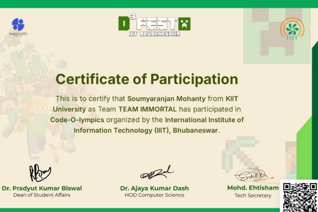 Harshit Kumar Singh secured 1st position in the “Decode and Dominate” competition at KIIT Fest 8.0, organized by KIIT Deemed to be University, Bhubaneswar, held from 14–16 February 2025.