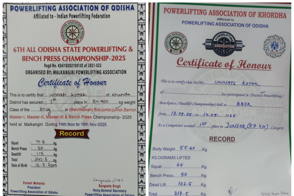 Also won first prize at States Powerlifting Championship of Odisha, held at Malkangiri, from 14 to 16 November 2025