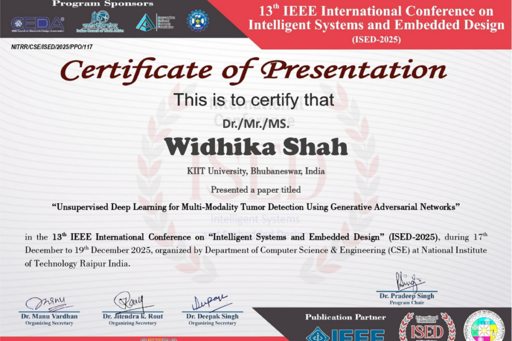 Widhika Shah received the certificate in presentation at NIT held at Raipur in December 2025.