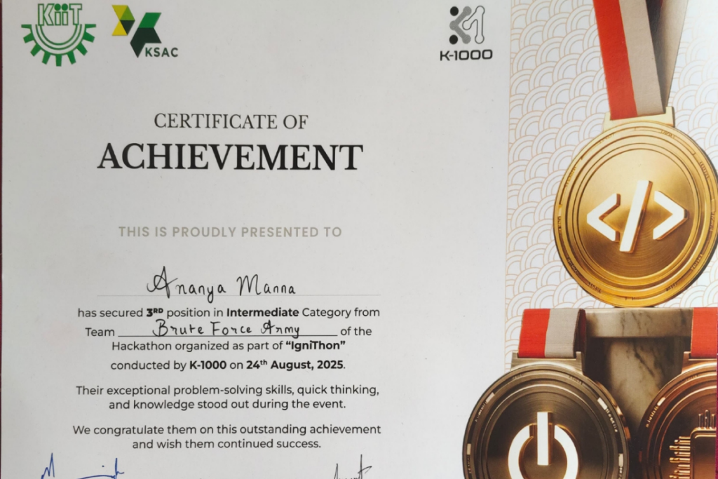 Ananya Manna has secured 3rd position in Intermediate category from team Brute Force Army in Ignithon Hackathon