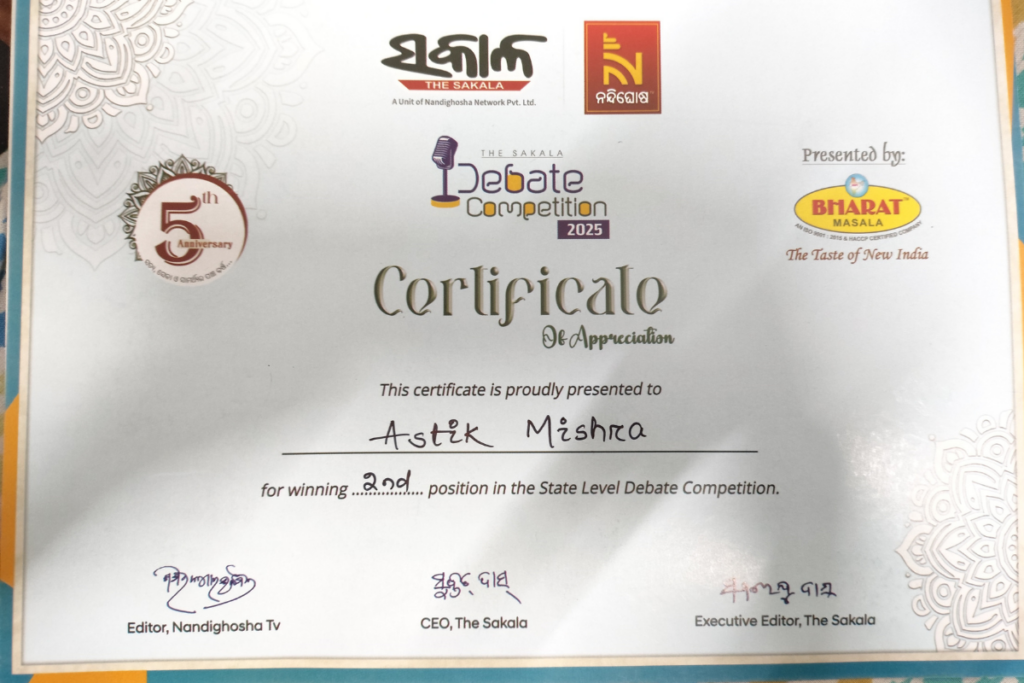 Astik Mishra recieved the second prize in Odia Debate at the state level Debate Competition held at Bhubaneswar in November 2025.