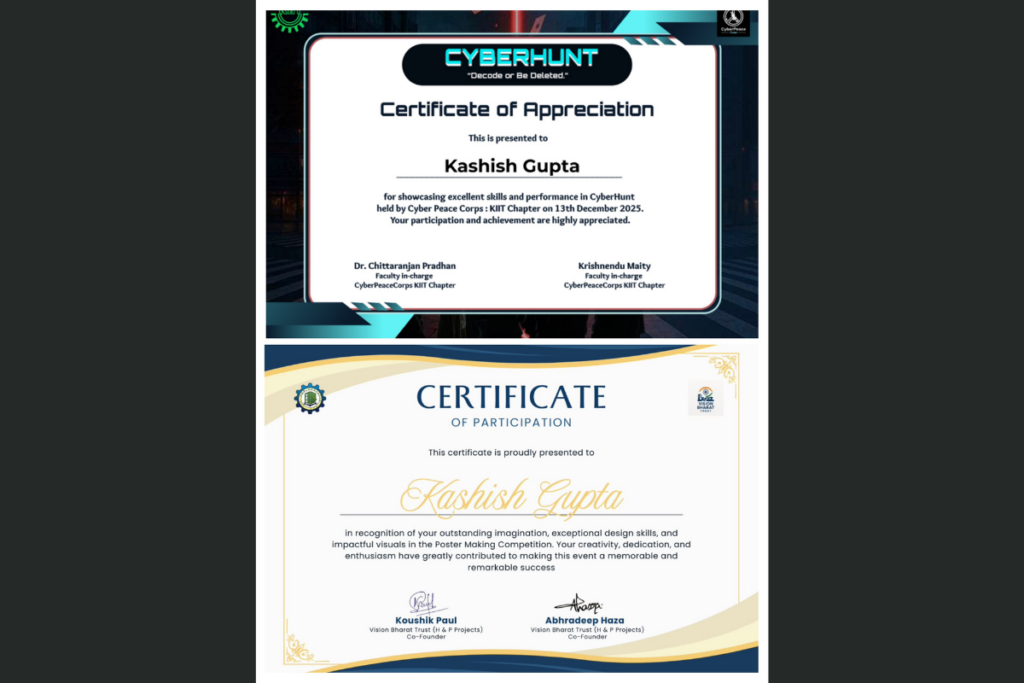 Kashish Gupta participated in the Poster Making Competition and CyberHunt organised by Vision Bharat Trust and Cyber Peace Corps-KIIT Chapter in 2025.