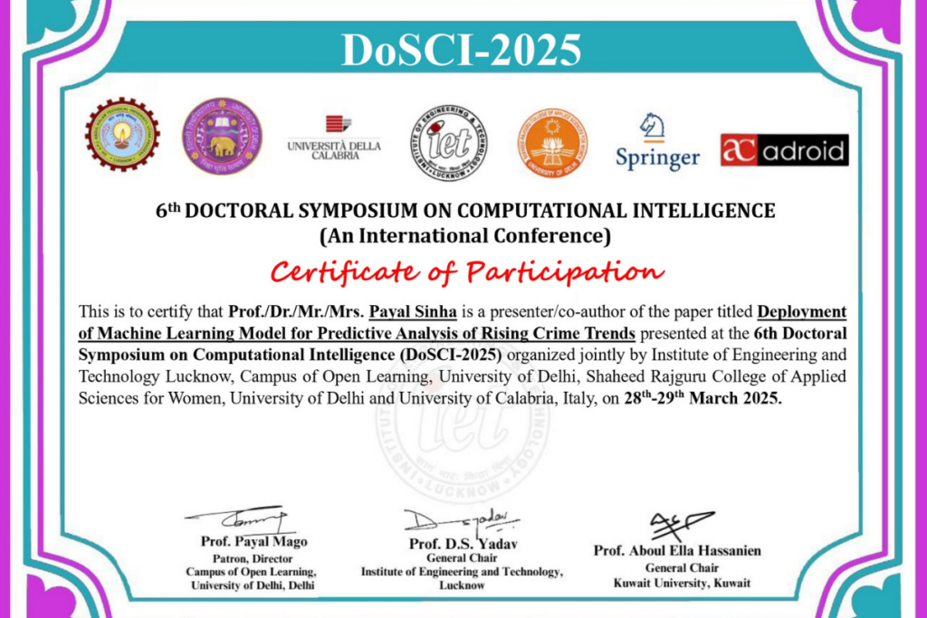 an international conference jointly organized by Institute of Engineering and Technology, Lucknow; Campus of Open Learning, University of Delhi; Shaheed Rajguru College of Applied Sciences for Women, University of Delhi; and University of Calabria, Italy, held on 28–29 March 2025. The paper titled “Deployment of Machine Learning Model for Predictive Analysis of Rising Crime Trends” focused on applying machine learning techniques for crime trend prediction and data-driven public safety analysis.